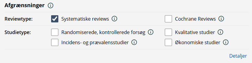 OBS! For at gøre din søgning så relevant som mulig, er yderligere afgrænsninger, som du ikke kan se i denne oversigt, allerede valgt. For at se alle de afgrænsninger, som er koblet på din søgning, kan du klikke på 'Detaljer'.